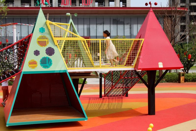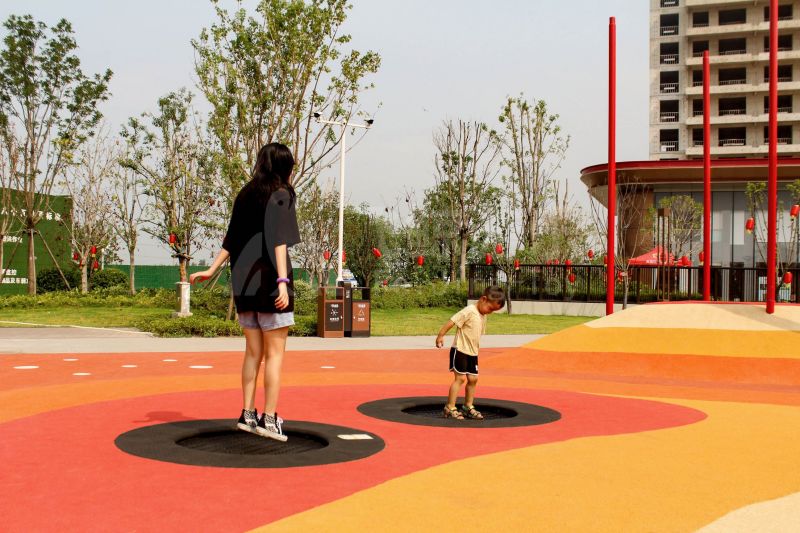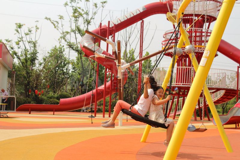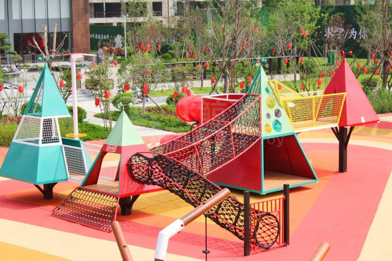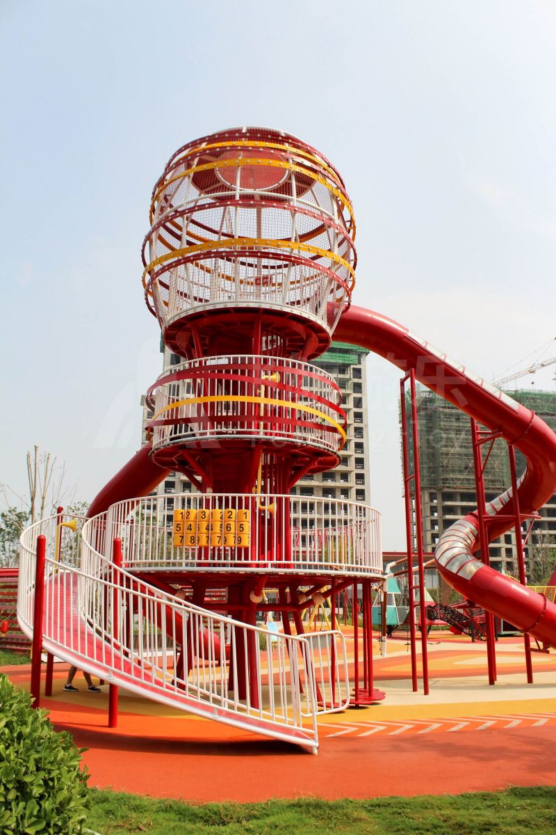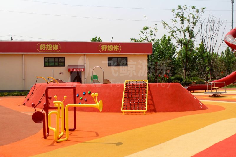 场地整体设计以集团产品“红枣”--红枣色系规划设计,彩色地绘红橙相间激发活力之情。灯塔滑梯由红枣造型设计提炼而成,白天他是火热的高塔滑梯,夜里他是闪烁美丽的灯塔。双滑梯体验不同高度滑落快乐,搭配益智小设备,陕西打击乐器、数字滚筒,玩法更多样。 勾勒地形,攀登或者滑下起伏之间多一种趣味,陕西爬网、攀登点、爬绳,总有一种让你体会到攀爬的快乐。精灵树屋乐趣多,攀爬至不同树屋,是属于自己秘密基地。驻足一番,看看风车,感受下夏天的风。绳网、木板、 多种材质攀爬和触摸,都在和自然对话。亲近自然的空间往往能够提供无形的吸引力,更多丰富的材料和空间,感知自然、与自然互动,能够让孩子们沉浸其中。 陕西秋千荡漾着,荡起内心的欢愉、安逸。大大的鸟巢秋千,可以坐着躺着,和小伙伴背靠背也是不错选择。月亮秋千给人梦幻感觉,让荡秋千多了一种梦幻感觉。骑上摇摇车,摇呀摇,摇到记忆里最快乐的时光。远处有朵散落的云,站在云朵上,蹦蹦跳跳。 飞鲸游乐本次儿童空间设计遵循趣味性的原则,曲线宽阔的奔跑环境、丰富活泼的色彩激起儿童自在玩耍。趣味设备点缀在场地各处,让儿童主动探索发现乐趣,尽情挥洒他们的天真与烂漫。