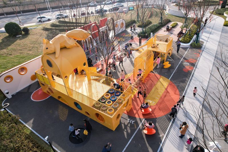 乐园地面黄橙色调的彩绘景观吸引行人不断来此探索,在乐园里玩耍或驻足休憩,包含各种地面游戏和游乐设备,让儿童和成人都可以享受轻松愉快的趣味时光。