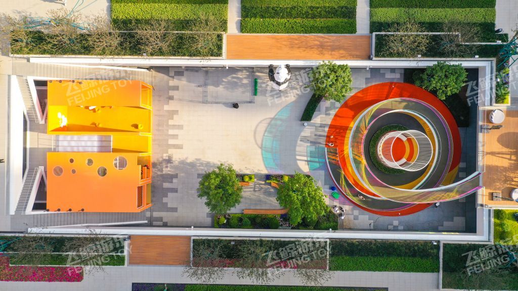 廊架延伸连接地面至下沉广场,通体围栏采用炫彩玻璃材质,不同角度折射出不同色彩,形与色,光与影之间创造出一种多维空间的沉浸式体验。红橙搭配地垫,为孩子们奔跑蹦跳玩耍提供缓冲保障。内部坐凳休憩感受阳光。廊架下是休憩好去处,孩子们嬉戏奔跑,在柔软泡泡椅里沐浴阳光,感受惬意时光。
